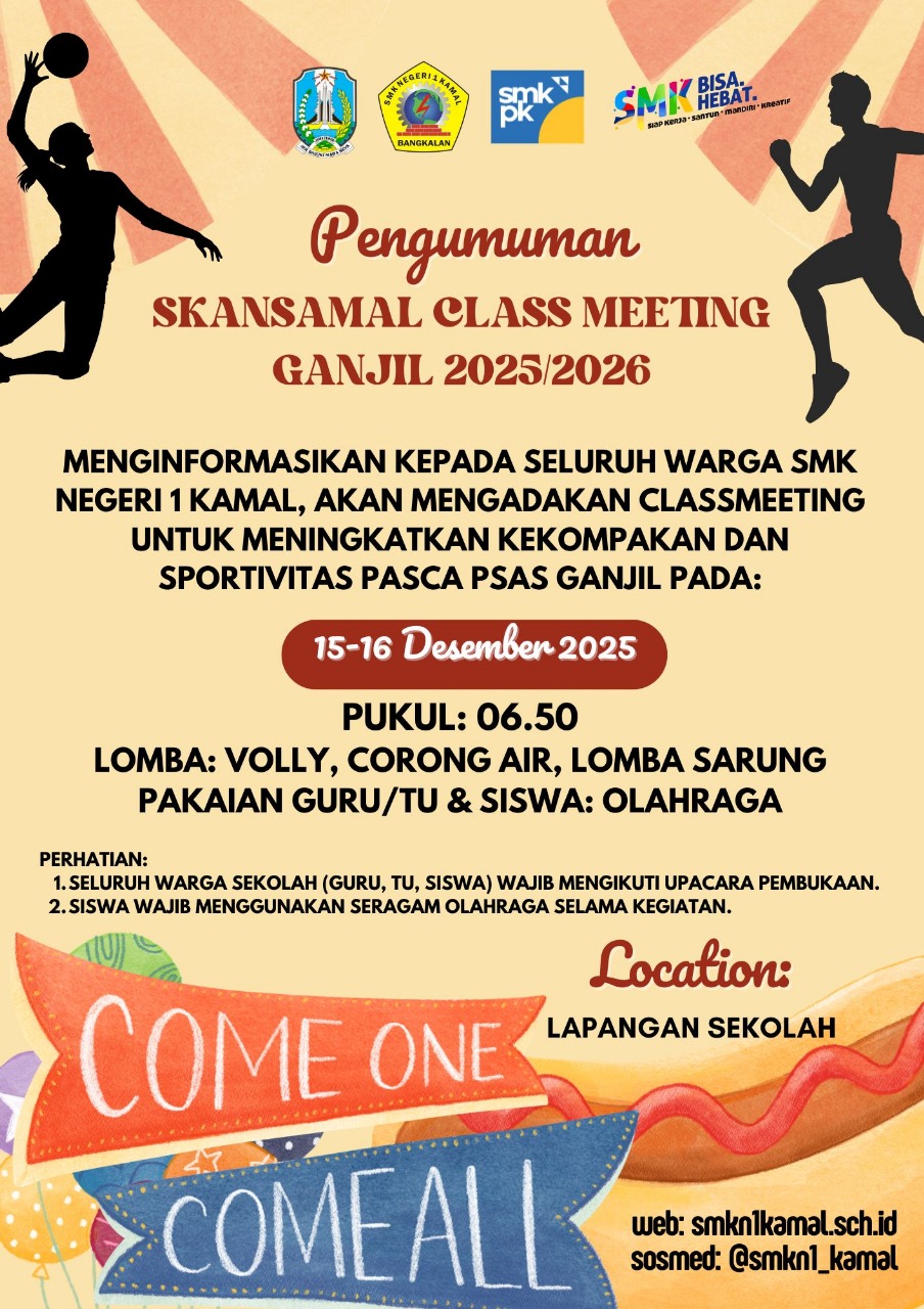 Menginformasikan kepada seluruh warga SMK Negeri 1 kKamal, akan mengadakan class meeting untuk meningkatkan kekompakan dan sportifitas pasca PSAS Ganjil pada 15-16 Desember 2025, Pukul 6.50 - Selesai, Lomba : Volly, Corong Air, Lomba Sarung. Pakaian Guru/TU & SIswa : Olahraga